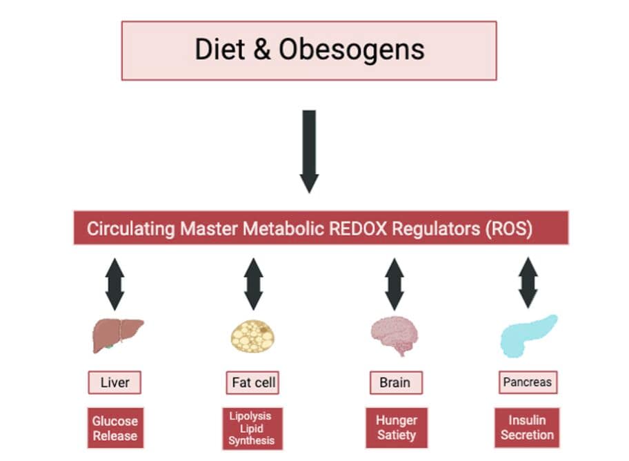 They propose a combined OBS/REDOX model where environmental chemicals (in air, food, food packaging, and household products) generate false autocrine and endocrine metabolic signals, including ROS, that undermine standard regulatory energy mechanisms, increase basal and stimulated insulin secretion, impair energy efficiency, and affect appetite and energy expenditure, leading to weight gain.